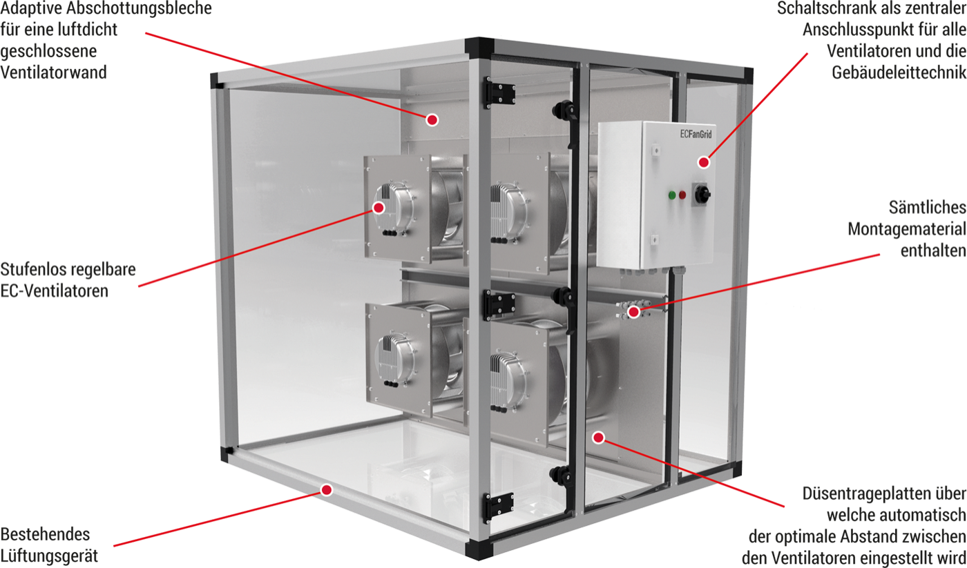 Bei einer ECFanGrid handelt es sich um mehrere parallel betriebene EC-Ventilatoren in einer Art Ventilatorwand. Dabei vervielfacht sich der Volumenstrom proportional der Ventilatoranzahl, bei gleichbleibenden Druckverhältnissen. Die eingesetzten EC-Ventilatoren sind dabei nicht nur hocheffizient, sie ermöglichen als perfekt abgestimmte Einheit (Elektronik, Motor & Laufrad) eine einfache Plug & Play Lösungen für nahezu jede lüftungstechnische Anforderung.