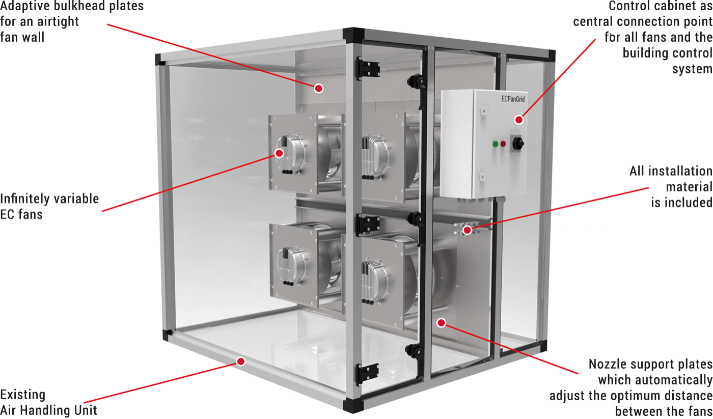 The ECFanGrid offers an absolute degree of reliability due to its "built-in" redundancy. In the unlikely event that a fan should fail, only this part of the airflow is lost. The loss of this airflow is then fully automatically compensated by increasing the speed of all other fans.